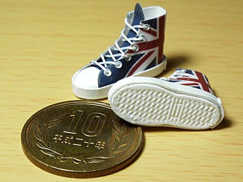 ユニオンフラッグデザインのミニチュアスニーカーを作りました。 前回、パステルカラーのハイカット2種を出品したのですが、『偽ブランド品』という名目で、違反通告が複数件あったので、タグや意匠と思われそうなものは排除しています。 英国旗デザインも通…