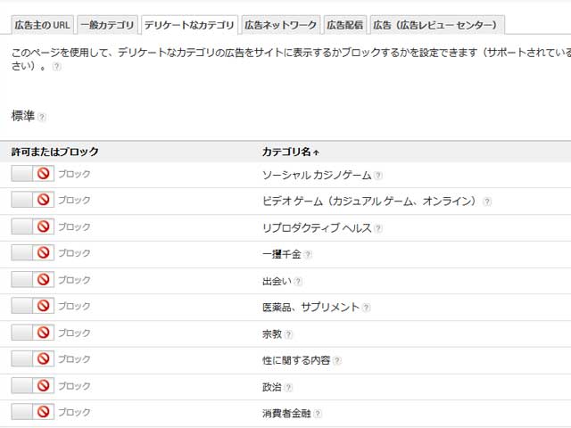 『デリケートなカテゴリ』のブロック例。個人的に、ギャンブル系や出会い系の広告などは、完全にブロックしています。たまにGoogleから、「このカテゴリのブロックを開放すると、〇〇%収益がアップしますよ~。」という誘惑の案内がきますけど、ここは譲れません。