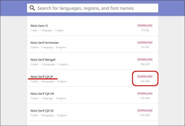私の場合、日本語フォントだけ欲しかったので、『Noto Serif CJK JP』のみダウンロードしました。たとえば、韓国語フォントも利用される方は『Noto Serif CJK KR』もダウンロードされてください。